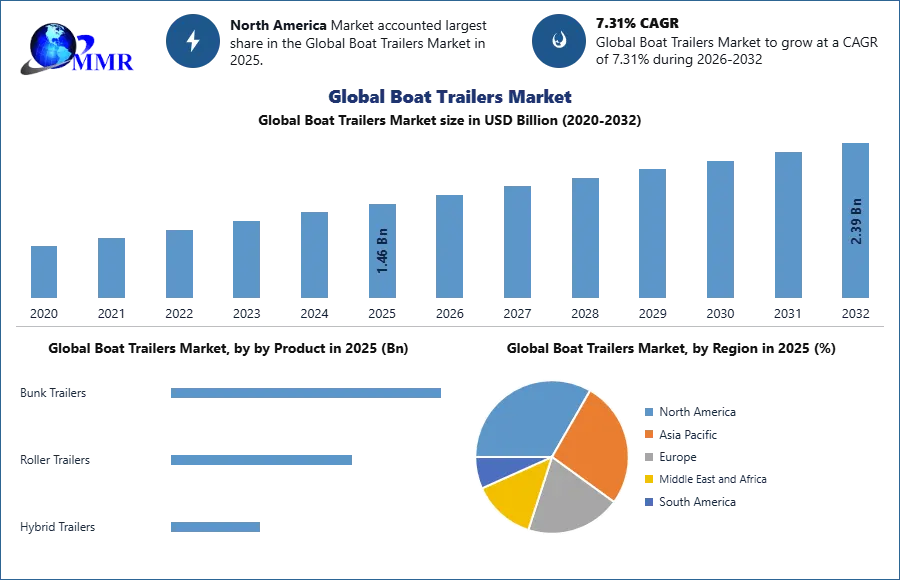 Boat Trailers Market is expected to reach US$ 2.39 Bn by 2032 from US$ 1.46 Bn in 2025 at a CAGR of 7.31% during a forecast period.