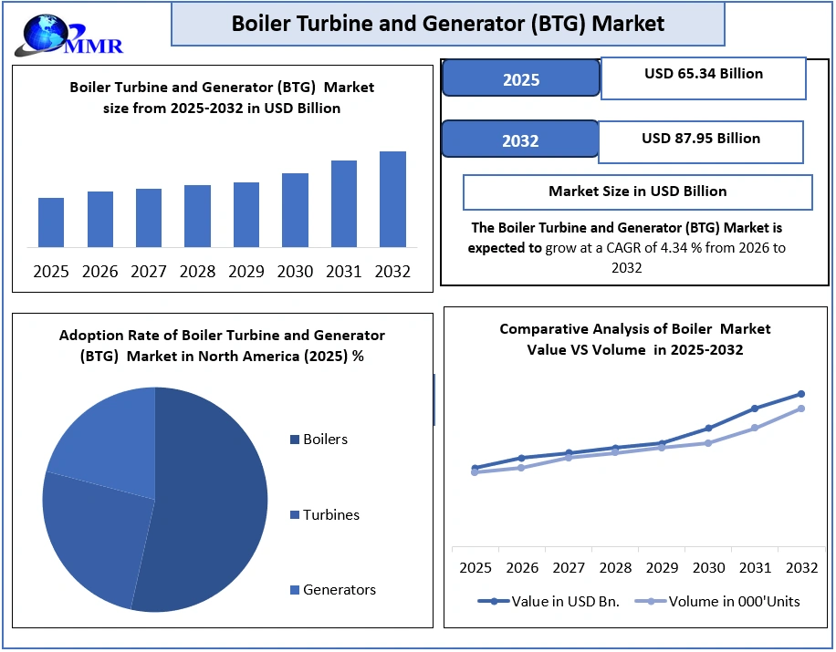 Global Boiler, Turbine, and Generator (BTG) Market Report Coverage Details Base Year: 2025 Forecast Period: 2026-2032 Historical Data: 2020 to 2025 Market Size in 2025: USD 65.34 Bn. Forecast Period 2026 to 2032 CAGR: 4.34% Market Size in 2032: USD 87.95 Bn. Segments Covered: by Component Boilers Turbines Generators by Fuel Type Coal Fired Gas Fired Oil Fired Biomass Fired by Application Baseload Power Generation Peaking Power Generation Cogeneration (CHP) Others Boiler, Turbine, and Generator (BTG) Market, by Region