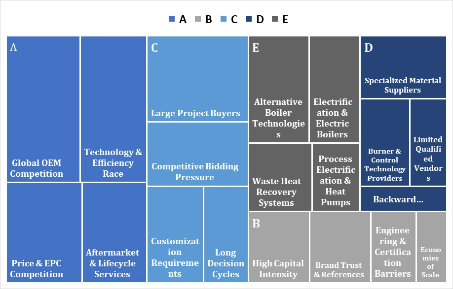 • Boilers (≈45% of BTG cost): The dominant subsegment, converting water into high-pressure steam. Demand is driven by the need for industrial and residential electricity, as well as stringent efficiency regulations. Supercritical and ultra-supercritical boilers are increasingly being adopted, particularly in the Asia Pacific (≈approximately 40% of the market), led by China and India, to ensure base load stability. • Gas-Fired (55.4%): Fastest-growing segment due to lower emissions, operational flexibility, and compatibility with renewables. Strong in North America and Europe with Combined Cycle Gas Turbines (CCGT). • Baseload Power Generation (65.34%): Core segment, requiring continuous supply. Largest revenue contributor. Predominantly in APAC (China, India) with large thermal plants using high-efficiency BTG technologies. The Boiler, Turbine, and Generator (BTG) market is driven by efficiency, sustainability, and growing industrial energy demands. Gas-fired systems and high-efficiency condensing technologies are expected to continue leading global adoption trends. Porter’s Five Forces Analysis of the Global Boiler, Turbine, & Generator (BTG) MarketThe tree map highlights market dynamics, showing high buyer power through large projects, competitive bidding, and long decision cycles. Intense OEM competition, technological advancements, and limited qualified suppliers shape supply-side pressures, while high capital intensity, brand trust, and economies of scale influence barriers to entry. Substitutes like alternative and electric boilers, along with waste heat recovery, further affect market competitiveness.