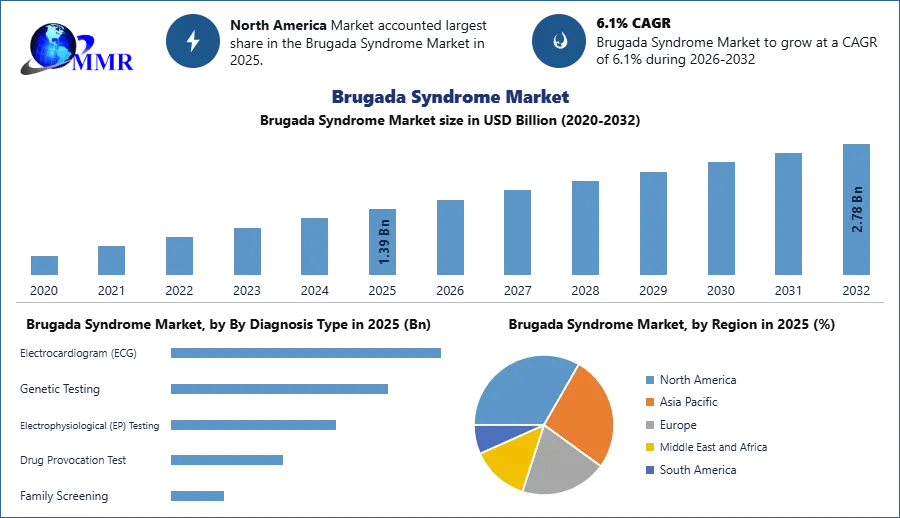 Brugada Syndrome Market size was valued at USD 1.39 Bn. in 2025 and the total Brugada Syndrome revenue is expected to grow at 6.1% through 2026 to 2032, reaching nearly USD 2.78 Bn.