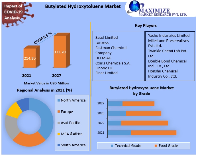 Bacteria, including such green algae, generate Butylated Hydroxytoluene (BHT). It is formed by the reaction 4-methyl phenol with 2-methyl propene for industrial purposes. Because of its antioxidant qualities, BHT is mostly utilised as a food preservative. It's also used to keep industrial additive fluids like oil and petrol from oxidizing. The impact of COVID-19 lockdown on market leaders, followers, & disruptors' revenue is examined in the research. Because the lockdown was implemented differently in different locations and countries, the impact of it varies by region and segment. The research has addressed the market's present short- and long-term impacts, & it will aid decision-makers in developing company plans & strategies by area.To know about the Research Methodology :- Request Free Sample Report