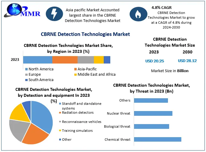 CBRNE Detection Technologies Market Report Coverage Details Base Year: 2023 Forecast Period: 2024-2030 Historical Data: 2018 to 2023 Market Size in 2023: US $ 20.25 Bn. Forecast Period 2024 to 2030 CAGR: 4.8% Market Size in 2030: US $ 28.12 Bn. Segments Covered: by Detection and equipment Standoff and standalone systems Radiation detectors Reconnaissance vehicles Training simulators Other by Threat Chemical threat Biological threat Nuclear threat Others CBRNE Detection Technologies Market, by Region