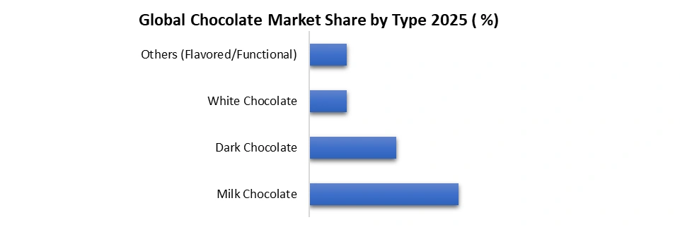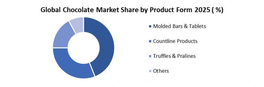 The Global Chocolate Market is highly diversified across multiple dimensions, enabling companies to target consumer preferences, optimize product offerings, and capture growth in premium, dark, organic, and gifting segments. Urbanization and e-commerce channels further support emerging market penetration. By Type: Milk chocolate dominated the Global Chocolate Market in 2025, while dark chocolate driven by health-conscious consumers. White chocolate is gaining traction in premium markets, and other variants, including flavored, filled, and functional chocolates, cater to niche indulgence preferences.By Product Form: Molded chocolates led the global Chocolate Market in 2025, driven by their wide availability, standardized formats, and strong demand across mass retail channels. Countline products, including individually wrapped and snack-size bars, followed, supported by impulse purchases and on-the-go consumption. Specialty formats such as truffles, pralines, and novelty shapes cater to premium, artisanal, and experience-driven consumer segments, reinforcing value growth despite lower volumes.