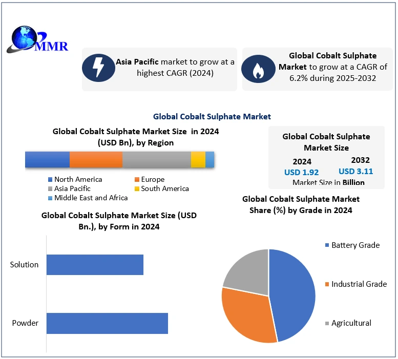 Global Cobalt Sulphate Market Report Coverage Details Base Year: 2024 Forecast Period: 2025-2032 Historical Data: 2019 to 2024 Market Size in 2024: USD 1.92 Bn. Forecast Period 2025 to 2032 CAGR: 6.2% Market Size in 2032: USD 3.11 Bn. Segments Covered: by Form Powder Solution by Grade Battery Grade Industrial Grade Agricultural by Application Hard facing/HSS & Other Alloy Magnet Hard Material Catalyst Color Battery Others by End-Use Industry Consumer Electronics Automotive (EV batteries) Industrial Aerospace Pharmaceuticals Agriculture Others Cobalt Sulphate Market, by Region