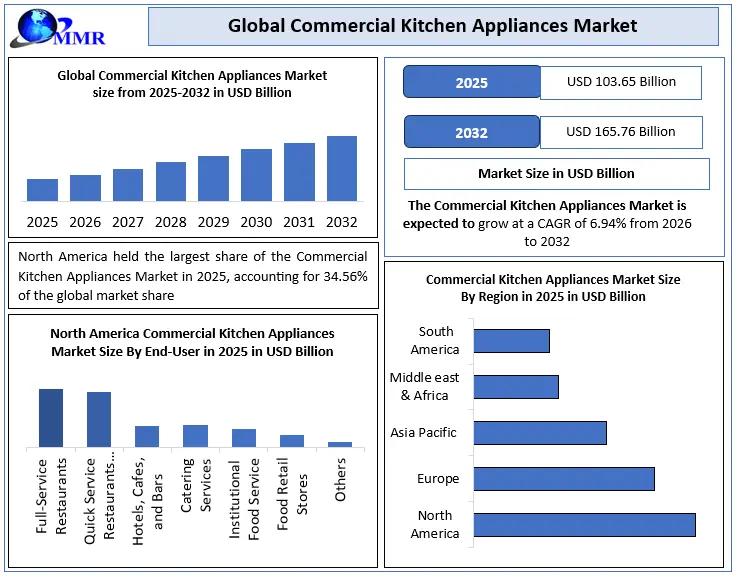 The Global Commercial Kitchen Appliances Market was valued at USD 103.65 billion in 2025 and is projected to reach USD 165.76 billion by 2032, expanding at a CAGR of 6.94% during the forecast period. Growth is driven by rapid urbanization, expansion of the foodservice industry, and rising demand from quick-service restaurants, hotels, cloud kitchens, and institutional catering. Increasing adoption of energy-efficient, smart, and automated kitchen appliances, along with stringent food safety and hygiene regulations, is further supporting market expansion.