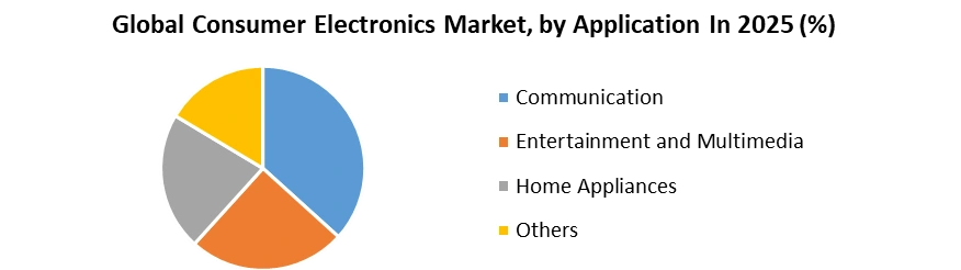 Based on Product, the market is segmented into Wearable devices, Smart Home Devices, and Others. The wearable devices segment dominated the market in 2025 and is expected to hold the largest Consumer Electronics Market share over the forecast period. Smart Home Devices hold the second largest position in the Consumer Electronics industry and dominated the market in 2025 and is expected to continue the dominance over the forecast period. The wearable devices segment in the consumer electronics market refers to a category of electronic devices that are worn on the body or integrated into clothing and accessories. These devices typically have sensors, processors, and connectivity capabilities, enabling them to track various health and fitness metrics, provide notifications, and offer other functionalities. The wearable devices segment has witnessed significant growth in recent years, driven by advancements in technology, increasing health consciousness, and the growing popularity of fitness tracking and smart accessories. Consumer adoption of wearable devices has been steadily increasing, driven by factors such as health and fitness awareness, technological advancements, and the availability of affordable devices. Wearable devices have become increasingly popular among fitness enthusiasts, athletes, health-conscious individuals, and tech-savvy consumers looking to track their wellness and lifestyle habits.Based on Application, the market is segmented into Communication, Entertainment and Multimedia, Home Appliances, and Others. Communication segment dominated the market in 2025 and is expected to hold the largest Consumer Electronics Market share over the forecast period. The communication segment in the consumer electronics industry encompasses a wide range of devices and technologies that facilitate communication and connectivity among individuals. These devices play a crucial role in modern-day communication, enabling people to stay connected, informed, and entertained. Smartphones are the cornerstone of the communication segment. They are handheld devices that integrate multiple communication functionalities, including voice calls, text messaging, email, instant messaging, social media, and video calls. Smartphones also serve as multimedia devices, allowing users to browse the internet, stream videos, listen to music, and access a vast array of apps for various purposes. The popularity of smartphones has surged globally, with billions of users relying on them for daily communication and entertainment.