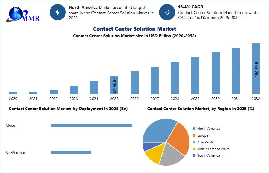 Global Contact Center Solution Market is anticipated to reach US$ 182.34 Bn by 2032 from US$ 62.98 Bn in 2025 at a CAGR of 16.4% during a forecast period.