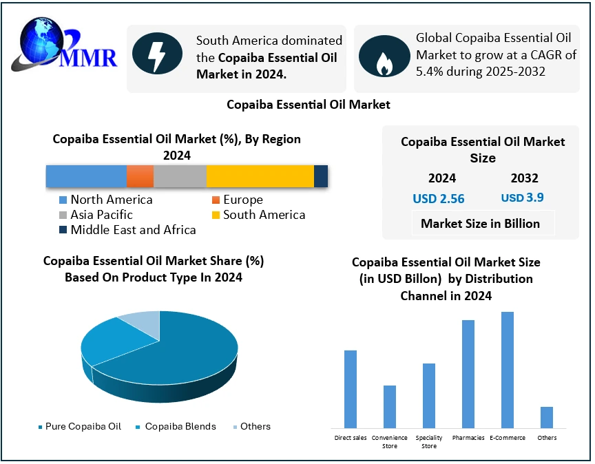 Global Copaiba Essential Oil Market Report Coverage Details Base Year: 2024 Forecast Period: 2025-2032 Historical Data: 2019 to 2024 Market Size in 2024: USD 2.56 Bn. Forecast Period 2025 to 2032 CAGR: 5.4% Market Size in 2032: USD 3.9 Bn. Segments Covered: by Product Type Pure Copaiba Oil Copaiba Blends Other by Nature Organic Conventional by Formulation Type Essential Oils, Diffusers and Oils by End-Use Food Industry Cosmetics & Personal Care Medicinal & Health Care Aromatherapy Retail/Household by Distribution Channel Direct Sales Convenience Store Specialty Store Pharmacies E-Commerce Others Copaiba Essential Oil Market, by Region