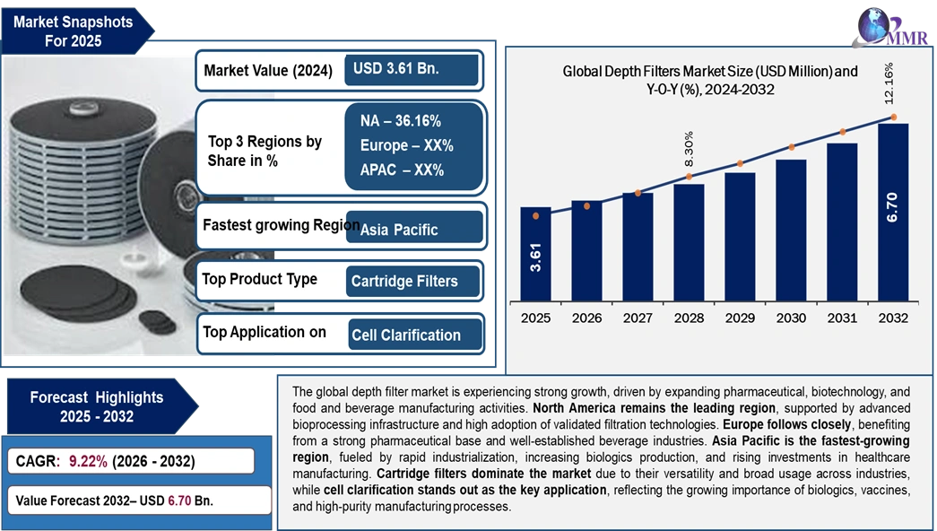 Global Depth Filters Market Report Coverage Details Base Year: 2025 Forecast Period: 2026-2032 Historical Data: 2020 to 2025 Market Size in 2025: USD 3.61 Bn. Forecast Period 2026 to 2032 CAGR: 9.22% Market Size in 2032: USD 6.71 Bn. Segments Covered: by Product Type Cartridge Filters Capsule Filters Filter Modules Filter Sheets by Material Diatomaceous Earth Activated Carbon Cellulose Perlite by Application Final Product Processing Cell Clarification Blood Separations Others by End-User Food and Beverage Industry Pharmaceuticals Biotechnology Others Depth Filters Market, by Region