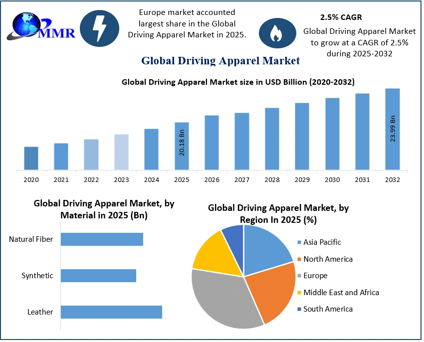 Global Driving Apparel Market Report Coverage Details Base Year: 2025 Forecast Period: 2026-2032 Historical Data: 2020 to 2025 Market Size in 2025: USD 20.18 Bn. Forecast Period 2026 to 2032 CAGR: 2.5% Market Size in 2032: USD 23.99 Bn. Segments Covered: by Product Type Clothing Footwear Protection Gear by Material Leather Synthetic Natural Fiber by Vehicle Type Two Wheeler Four Wheeler by Distribution Channel E-commerce Supermarket/Hypermarket Brand Outlets Discount Stores Driving Apparel Market, by Region