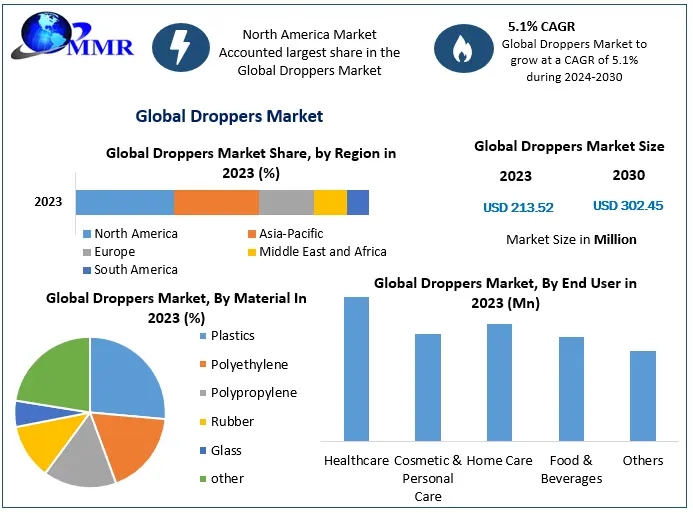 Global Droppers Market size was valued at US$ 213.52 Mn in 2023 and the total revenue is expected to grow at 5.1% through 2024 to 2030, reaching nearly US$ 302.45 Mn. The global Droppers market report is a comprehensive analysis of the industry, market, and key players. The report has covered the market by demand and supply-side by segments. The global Droppers report also provides trends by market segments, technology, and investment with a competitive landscape.To know about the Research Methodology :- Request Free Sample Report
