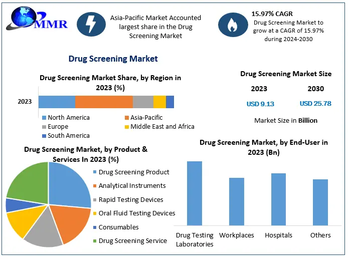 Drug Screening Market Report Coverage Details Base Year: 2023 Forecast Period: 2024-2030 Historical Data: 2018 to 2023 Market Size in 2023: USD 9.13 Bn. Forecast Period 2024 to 2030 CAGR: 15.97% Market Size in 2030: USD 25.78 Bn. Segments Covered: by Product & Services Drug Screening Product Analytical Instruments Rapid Testing Devices Oral Fluid Testing Devices Consumables Drug Screening Service by Sample Type Urine Samples Blood Samples Oral Fluid Samples Hair Samples Other Samples by Drug Type Alcohol Cannabis/Marijuana Cocaine Opioids Amphetamine & Methamphetamine LSD Others by End-User Drug Testing Laboratories Workplaces Hospitals Others Drug Screening Market, by Region
