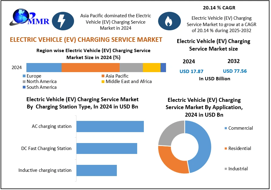 The Electric Vehicle (EV) Charging Service Market size was valued at USD 17.87 billion in 2024, and the total Revenue is expected to grow at a CAGR of 20.14 % from 2025 to 2032, reaching nearly USD 77.56 billion. Electric Vehicle (EV) Charging Service Market Overview: The MMR report provides an in-depth and structured analysis of the Electric Vehicle (EV) Charging Service Market, covering all critical dimensions influencing market growth and long-term sustainability. It evaluates EV consumption patterns and infrastructure demand by analyzing leading EV-adopting countries, regional EV stock growth, vehicle-type adoption, and the charging behavior of top EV brands. The report further examines charging infrastructure penetration, including public charger density, network saturation levels, and urban–highway infrastructure gaps. Detailed insights into grid integration address load profiles, peak demand impacts, utility coordination, V2G readiness, and renewable energy integration. In addition, the report assesses emerging technologies such as ultra-fast and wireless charging, smart charging platforms, AI-driven planning tools, and digital ecosystems. It also analyzes evolving business models, pricing mechanisms, public–private investment structures, and monetization opportunities. Finally, the report highlights environmental and sustainability considerations, including grid emission impacts, circular economy models, second-life battery reuse, and the role of EV charging infrastructure in transport sector decarbonization. The report includes an analysis of the impact of COVID-19 lockdown on the revenue of market leaders, followers, and disruptors. Since the lockdown was implemented differently in various regions and countries; the impact of the same is also seen differently by regions and segments. The report has covered the current short-term and long-term impact on the market, and it would help the decision-makers to prepare the outline and strategies for companies by region. As the number of electric vehicle consumers keeps increasing, companies will have the opportunity to lift their sales and revenue not only by selling electric vehicles but also by providing Electric vehicle charging services to the users. Electric vehicles require recharging in-between for long-distance routes due to their low-energy density batteries, hence a strong network of EV charging service providers is necessary for the growth of the industry. Although this market is less developed in emerging countries, it is a promising market with future prospects. The report has covered, demand drivers by region, pricing by region, and profit margins of key players operating in this industry. A brief analysis of restraints and challenges in the market is also covered with examples by region. It also has covered the analysis of key player’s growth strategies, micro and macro analysis of markets, key developments, and key trends in the market.To know about the Research Methodology :- Request Free Sample Report