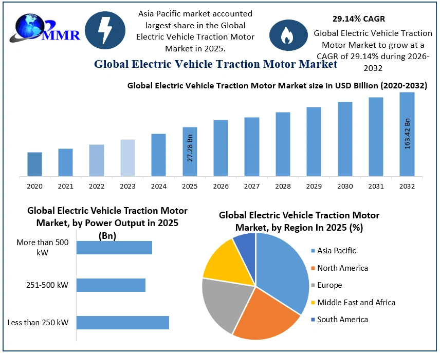 The Electric Vehicle Traction Motor Market size was valued at USD 27.28 Billion in 2025 and the total Electric Vehicle Traction Motor revenue is expected to grow at a CAGR of 29.14% from 2026 to 2032, reaching nearly USD 163.42 Billion by 2032.