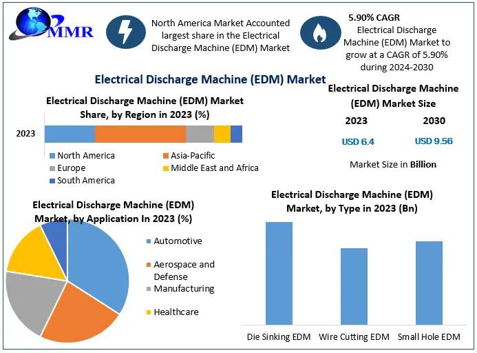 Global Electrical Discharge Machine (EDM) Market Report Coverage Details Base Year: 2023 Forecast Period: 2024-2030 Historical Data: 2018 to 2023 Market Size in 2023: USD 6.4 Bn. Forecast Period 2024 to 2030 CAGR: 5.90% Market Size in 2030: USD 9.56 Bn. Segments Covered: by Type Die Sinking EDM Wire Cutting EDM Small Hole EDM by Application Automotive Aerospace and Defense Manufacturing Healthcare Others Global Electrical Discharge Machine (EDM) Market, by Region