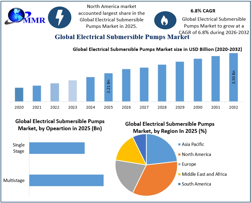 The Electrical Submersible Pumps Market size was valued at USD 2.21 Billion in 2025 and the total Electrical Submersible Pumps revenue is expected to grow at a CAGR of 6.8% from 2025 to 2032, reaching nearly USD 3.50 Billion by 2032.Electrical Submersible Pumps (ESPs) Market Overview: