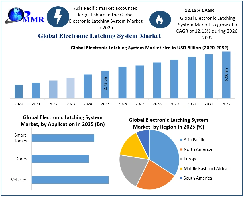 Global Electronic Latching System Market Report Coverage Details Base Year: 2025 Forecast Period: 2026-2032 Historical Data: 2020 to 2025 Market Size in 2025: USD 2.72 Bn. Forecast Period 2026 to 2032 CAGR: 12.13% Market Size in 2032: USD 6.06 Bn. Segments Covered: by Product Door Electronic Latching Systems Vehicle Electronic Latching Systems by Authentication Method Passwords Security Tokens Biometrics RFID by Application Vehicles Doors Smart Homes Electronic Latching System Market, by Region