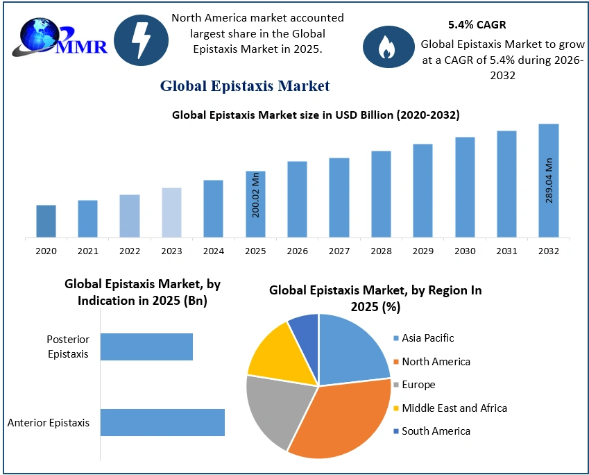 Global Epistaxis Market Report Coverage Details Base Year: 2025 Forecast Period: 2026-2032 Historical Data: 2020 to 2025 Market Size in 2025: USD 200.02 Mn. Forecast Period 2026 to 2032 CAGR: 5.4% Market Size in 2032: USD 289.04 Mn. Segments Covered: by Product Vasoconstrictors Anesthetics Antibiotic ointments Cauterizing agents by Indication Anterior Epistaxis Posterior Epistaxis by Distribution Channel Hospital Specialty Clinics Retail Pharmacies Other Distribution Channels Global Epistaxis Market, by Region
