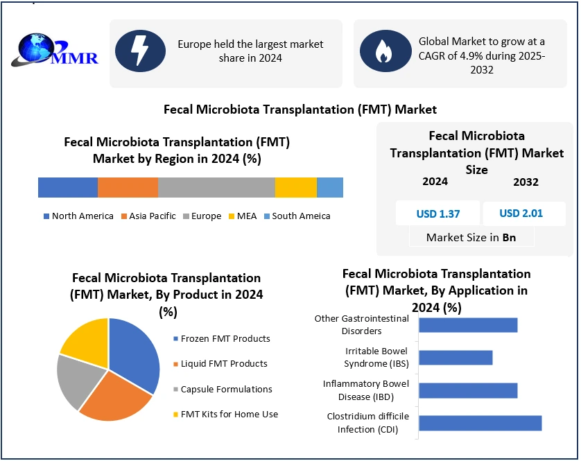 Global Fecal Microbiota Transplantation (FMT) Market Report Coverage Details Base Year: 2024 Forecast Period: 2025-2032 Historical Data: 2019 to 2024 Market Size in 2024: USD 1.37 Bn. Forecast Period 2025 to 2032 CAGR: 4.9% Market Size in 2032: USD 2.01 Bn. Segments Covered: by Product Type Frozen FMT Products Liquid FMT Products Capsule Formulations FMT Kits for Home Use by Application Clostridium difficile Infection (CDI) Inflammatory Bowel Disease (IBD) Irritable Bowel Syndrome (IBS) Other Gastrointestinal Disorders by Method of Administration Colonoscopy Enema Nasogastric Tube Oral Capsules by Donor Type Related Donors Unrelated Donors Screened Donor Programs Anonymous Donations by End User Hospitals Specialty Clinics Home Care Settings Research Institutions Fecal Microbiota Transplantation (FMT) Market, by Region