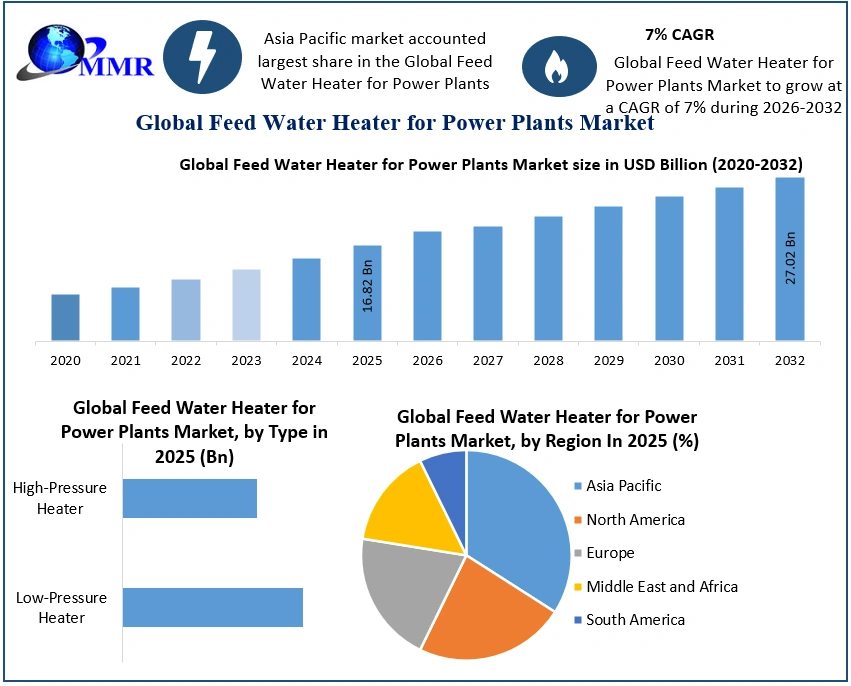 Global Feed Water Heater for Power Plants Market Report Coverage Details Base Year: 2025 Forecast Period: 2026-2032 Historical Data: 2020 to 2025 Market Size in 2025: USD 16.82 Bn. Forecast Period 2026 to 2032 CAGR: 7% Market Size in 2032: USD 27.02 Bn. Segments Covered: by Application Steam-Powered Power Plant Gas-Powered Power Plant Nuclear-Powered Power Plant by Type Low-Pressure Heater High-Pressure Heater Global Feed Water Heater for Power Plants Market, by Region