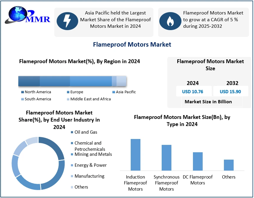 Global Flameproof Motors Market Report Coverage Details Base Year: 2024 Forecast Period: 2025-2032 Historical Data: 2019 to 2024 Market Size in 2024: USD 10.76 Bn. Forecast Period 2025 to 2032 CAGR: 5% Market Size in 2032: USD 15.90 Bn. Segments Covered: by Type Induction Flameproof Motors Synchronous Flameproof Motors DC Flameproof Motors Others by Type of Hazardous Area Zone 0 Zone 1 Zone 2 by Power Rating Up to 15 kW 16-100 kW Above 100 kW by Mounting Type Foot-mounted Flange-mounted Others by Cooling Method Air Cooled Water Cooled Self-ventilated Others by End User Industry Oil and Gas Chemical and Petrochemicals Mining and Metals Energy & Power Manufacturing Others Flameproof Motors Market, by Region