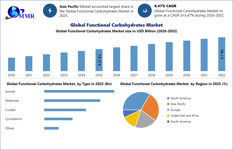 Functional Carbohydrates Market was valued at US$ 4.32 Bn. in 2025. Global Functional Carbohydrates Market size is estimated to grow at a CAGR of 6.47% during the forecast period.