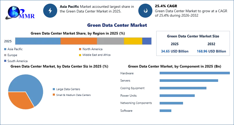 Global Green Data Center Market size was valued at USD 34.65 Bn. in 2025 and the total Green Data Center Market revenue is expected to grow by 25.4% from 2026 to 2032, reaching nearly USD 168.96 Bn.