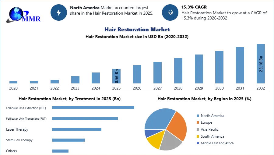 The Hair Restoration Market size was valued at USD 8.56 Billion in 2025 and the total Hair Restoration revenue is expected to grow at a CAGR of 15.3% from 2025 to 2032, reaching nearly USD 23.17 Billion.