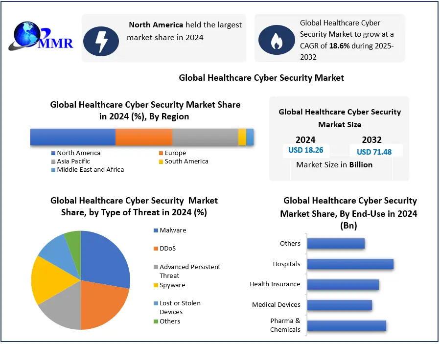 Global Healthcare Cyber Security Market Report Coverage Details Base Year: 2024 Forecast Period: 2025-2032 Historical Data: 2019 to 2024 Market Size in 2024: USD 18.26 Bn. Forecast Period 2025 to 2032 CAGR: 18.6% Market Size in 2032: USD 71.48 Bn. Segments Covered: by Type of Solution Identity and Access Management Risk and Compliance Management Antivirus and Antimalware DDoS Mitigation Security Information and Event Management Intrusion Detection System/ Intrusion Prevention System Others by Type of Threat Malware DDoS Advanced Persistent Threat Spyware Lost or Stolen Devices Others by Security Type Network Security Application Security Device Security Cloud Security Endpoint Security by Deployment Type On-Premises Cloud-Based by End User Hospitals Health Insurance Companies Pharmaceuticals & Biotechnology Companies Medical Device Companies Others Healthcare Cyber Security Market, by Region