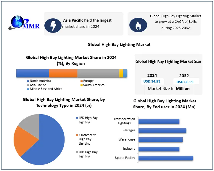 High Bay Lighting Market Report Coverage Details Base Year: 2024 Forecast Period: 2025-2032 Historical Data: 2019 to 2024 Market Size in 2024: USD 34.93 Mn. Forecast Period 2025 to 2032 CAGR: 8.4% Market Size in 2032: USD 66.59 Mn. Segments Covered: by Technology LED High Bay Lighting Fluorescent High Bay Lighting HID High Bay Lighting by Application Industrial Commercial Others by Wattage Range Below 100 W 100–250 W Above 250 W by Installation Type New LED Installations Retrofit LED Upgrades by End Use Sports Facility Industry Warehouse Garages Transportation Lightings High Bay Lighting Market, by Region