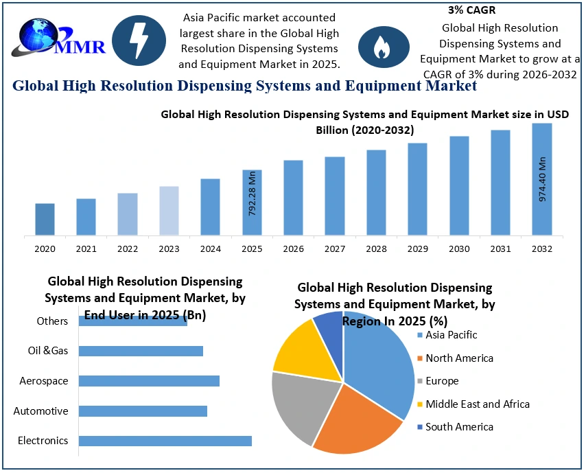 Global High Resolution Dispensing Systems and Equipment Market Report Coverage Details Base Year: 2025 Forecast Period: 2026-2032 Historical Data: 2020 to 2025 Market Size in 2025: USD 792.28 Mn. Forecast Period 2026 to 2032 CAGR: 3% Market Size in 2032: USD 974.40 Mn. Segments Covered: by Type Semi-Automatic Dispensing Systems Automatic Dispensing Systems by Application Electronics Adhesive and Sealant Dispensers Electrical Conductive Adhesives Nonconductive Adhesives Glue Dispensers Liquid Material Dispensers Powder Dispensers Others by End User Electronics Automotive Aerospace Oil &Gas Others High Resolution Dispensing Systems and Equipment Market, by Region