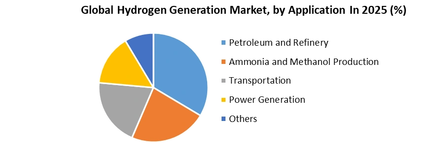 Based on the Application, the Hydrogen Generation Market is segmented into Petroleum and Refinery, Ammonia and Methanol Production, Transportation, Power Generation, and Others. The Ammonia and Methanol production segment held the largest market share, accounting for 38% in 2025. Ammonia plants consume a considerable portion of the hydrogen produced. Hydrogen is typically manufactured on-site in ammonia facilities using fossil fuel as a feedstock. With its ease of use and low cost, this application has traditionally had a huge consumer base. Ammonia is used extensively in the fertiliser manufacturing process.
