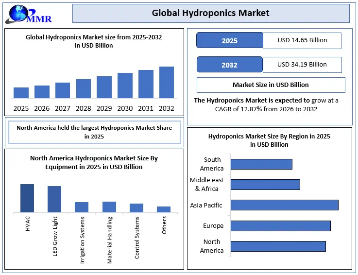 The Global Hydroponics Market was valued at USD 14.65 billion in 2025 and is expected to reach USD 34.19 billion by 2032, growing at a CAGR of 12.87% during the forecast period. Market growth is primarily driven by increasing urbanization, rising commercial and residential construction, and heightened awareness of hygiene and sanitation standards.