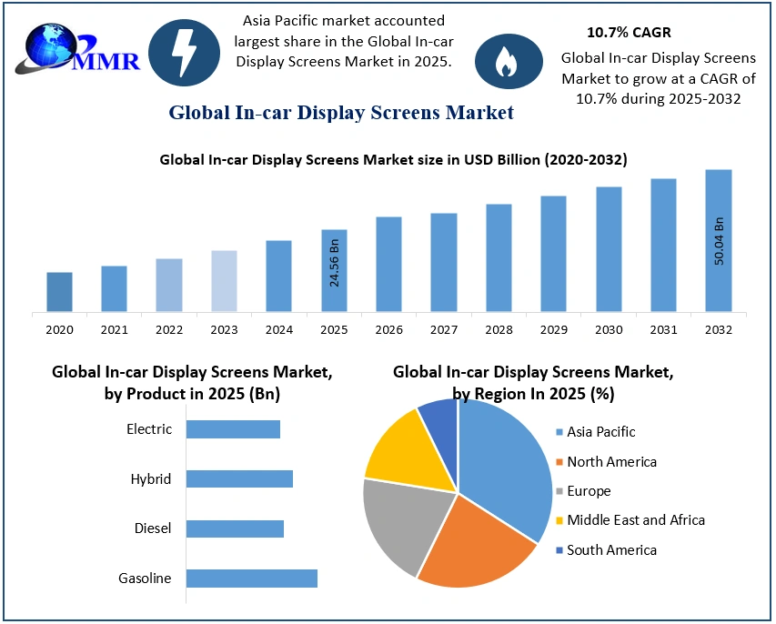 In-car Display Screens Market Report Coverage Details Base Year: 2025 Forecast Period: 2026-2032 Historical Data: 2020 to 2025 Market Size in 2025: USD 24.56 Bn. Forecast Period 2026 to 2032 CAGR: 10.7% Market Size in 2032: USD 50.04 Bn. Segments Covered: by Product Gasoline Diesel Hybrid Electric by Type Passenger vehicles Commercial Vehicles In-car Display Screens Market, by Region