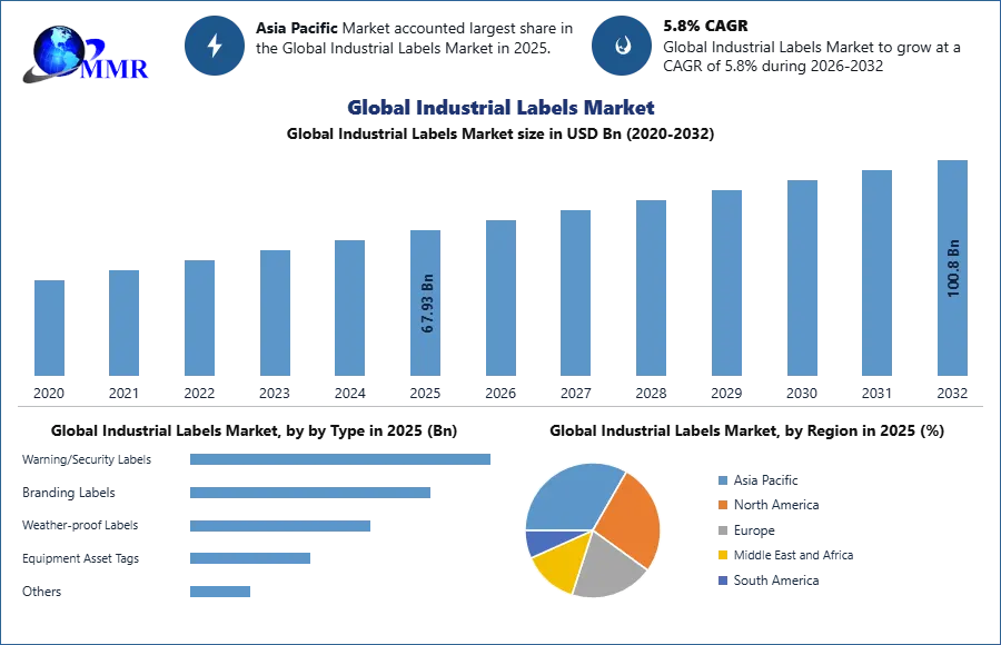 Global Industrial Labels Market was valued at USD 67.93 Bn in 2025 and is expected to reach USD 100.8 Bn by 2032, growing at a CAGR of 5.8% during the forecast period