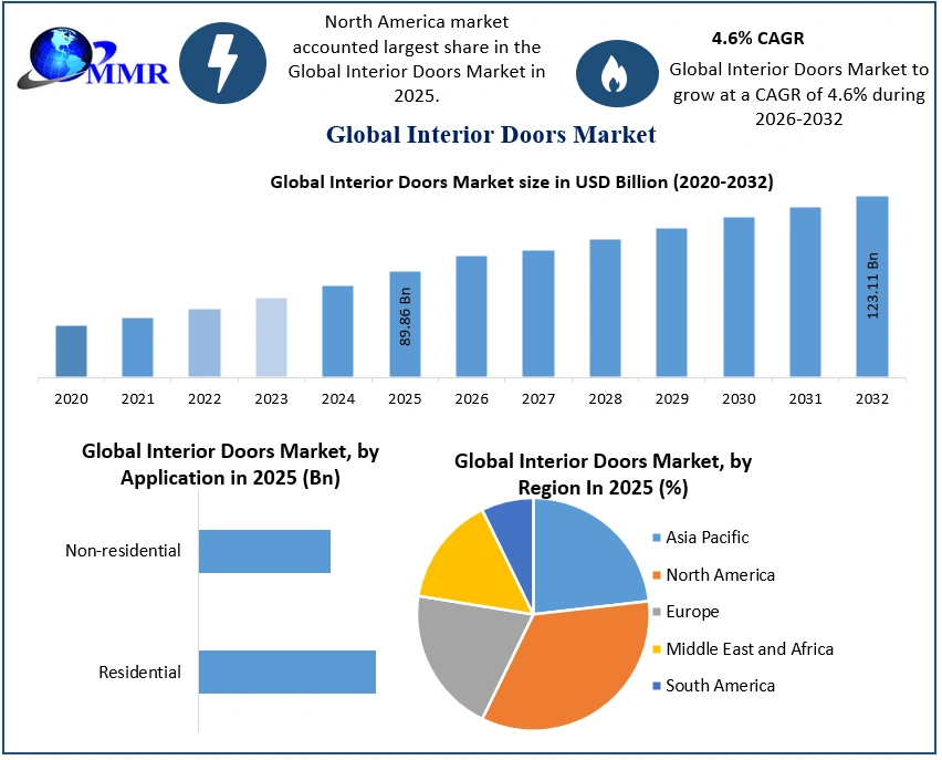 Interior Doors Market Report Coverage Details Base Year: 2025 Forecast Period: 2026-2032 Historical Data: 2020 to 2025 Market Size in 2025: USD 89.86 Bn. Forecast Period 2026 to 2032 CAGR: 4.6% Market Size in 2032: USD 123.11 Bn. Segments Covered: by Material Wood Glass Metal Composite Plastic Others by Door type Panel Bypass Bifold Pocket Others by Mechanism Swinging doors Sliding doors Folding doors Revolving doors Others by Application Residential Non-residential Interior Doors Market, by Region: