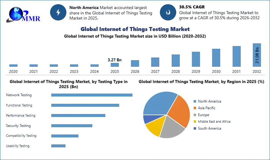 Internet of Things Testing Market size was valued at USD 3.27 Bn. in 2025 and the total revenue is expected to grow at 30.5% through 2026 to 2032, reaching nearly USD 21.08 Bn.