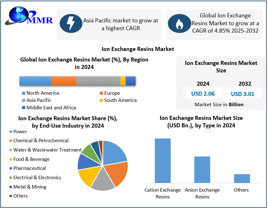 Global Ion Exchange Resins Market Report Coverage Details Base Year: 2024 Forecast Period: 2025-2032 Historical Data: 2019 to 2024 Market Size in 2024: USD 2.06 Bn. Forecast Period 2025 to 2032 CAGR: 4.85% Market Size in 2032: USD 3.01 Bn. Segments Covered: by Type Cation Exchange Resins Anion Exchange Resins Others by Application Water Treatment Chemical Processing Pharmaceuticals Food and Beverage Nuclear Power by End Use Industry Power Chemical & Petrochemical Water & Wastewater Treatment Food & Beverage Pharmaceutical Electrical & Electronics Metal & Mining Others Global Ion Exchange Resins Market, by Region