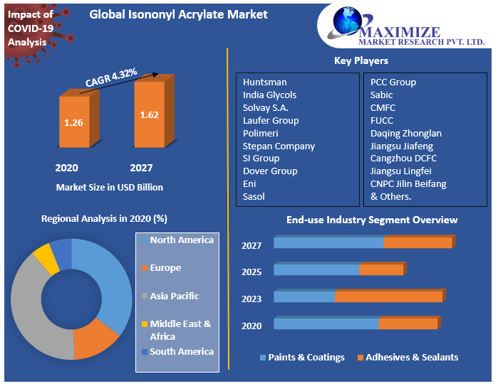 In 2021, Asia Pacific was dominant and held xx% of the overall market share in terms of revenue. It is also expected to continue its dominance over the forecast period thanks to the growing paints and coatings industry in the region. The chemical sector in the region is growing in response to the rising population and per capita income. As per the ECIC (European Chemical Industry Council), China was the world's largest chemical producer in 2021, with the US $xx billion in sales, contributing to xx% of global chemical sales. Brazil, Russia, India, and China (BRIC) countries accounted for xx% of worldwide chemical sales in 2021. Six of the top ten chemical producers are Asian, accounting for $xx billion in sales, or xx% of the global market. China's revenues (the US $xx) are higher than Europe and the United States combined (the US $xx billion + the US $xx billion). As a result of the growing paints and coatings industry, demand for isononyl acrylate is expected to rise, driving the market in the Asia Pacific region during the forecast period. The objective of the report is to present a comprehensive analysis of the global market to the stakeholders in the industry. The past and current status of the industry with the forecasted market size and trends are presented in the report with the analysis of complicated data in simple language. The report covers all the aspects of the industry with a dedicated study of key players that include market leaders, followers, and new entrants. PORTER, PESTEL analysis with the potential impact of micro-economic factors of the market have been presented in the report. External as well as internal factors that are supposed to affect the business positively or negatively have been analyzed, which will give a clear futuristic view of the industry to the decision-makers. The report also helps in understanding the global market dynamics, structure by analyzing the market segments and project the global market size. Clear representation of competitive analysis of key players by product, price, financial position, product portfolio, growth strategies, and regional presence in the global market makes the report investor's guide.Isononyl Acrylate Market Scope: Inquire before buying
