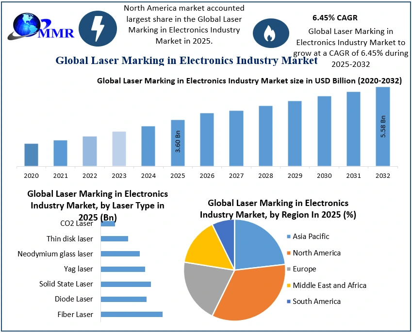 Laser Marking in Electronics Industry Market Report Coverage Details Base Year: 2025 Forecast Period: 2026-2032 Historical Data: 2020 to 2025 Market Size in 2025: USD 3.60 Bn. Forecast Period 2026 to 2032 CAGR: 6.45% Market Size in 2032: USD 5.58 Bn. Segments Covered: by Laser Type Fiber Laser Diode Laser Solid State Laser Yag laser Neodymium glass laser Thin disk laser CO2 Laser by Offering Hardware Laser Controller Filter Rotary device Galvanometer Power supply Software Services Laser Marking in Electronics Industry Market, by Region