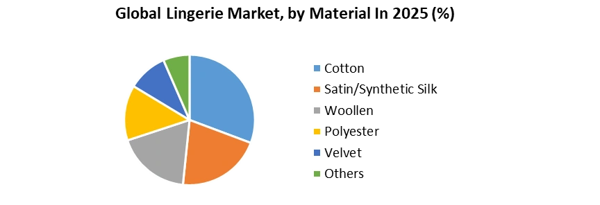 Based on Product, the lingerie market was divided into Bras, Knickers & Panties, Loungewear, Shapewear, and Others. The Bra segment accounted for the largest share in 2025 and continued to dominate due to its essential role in everyday wear. More than 40–45% of total women’s lingerie purchases globally consisted of bras, driven by rising demand for seamless bras, wire-free designs, T-shirt bras, and sports bras. Sports bras in particular, with 20–25% annual growth, supported by increasing fitness adoption among women worldwide. The Knickers & Panties segment followed, driven by high replacement rates averaging 10–15 pairs per woman annually. The Shapewear category emerged as the fastest-growing segment, expanding at 7–9% CAGR, fueled by growing body-positivity trends and social media influence. Loungewear also gained momentum as post-pandemic comfort trends encouraged the shift toward soft, breathable home-wear styles.Based on Material, the lingerie market was divided into Cotton, Satin/Synthetic Silk, Woollen, Polyester, Velvet, and Others. Cotton remained the dominant material segment in 2025, representing 35–40% of global lingerie production, owing to its softness, durability, and high breathability. In hot and humid regions such as Asia Pacific, over half of all bras and panties sold contained cotton due to comfort needs. Satin and synthetic silk were the fastest-growing materials, supported by rising interest in premium lingerie, bridal collections, and sensual nightwear. Demand for satin lingerie increased 8–10% annually, especially among younger consumers seeking affordable luxury. Velvet and microfiber blends expanded due to their smooth texture and suitability for seamless lingerie and shapewear. Polyester-based lingerie also grew steadily owing to its low cost, lightweight feel, and versatility. Meanwhile, sustainable materials such as recycled polyester and biodegradable silk gained traction, appealing to eco-conscious buyers.