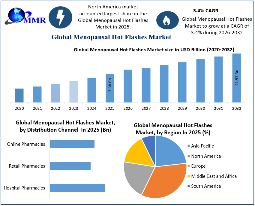 Menopausal Hot Flashes Market Report Coverage Details Base Year: 2025 Forecast Period: 2026-2032 Historical Data: 2020 to 2025 Market Size in 2025: USD 17.38 Bn. Forecast Period 2026 to 2032 CAGR: 3.4% Market Size in 2032: USD 21.97 Bn. Segments Covered: by Treatment Type Hormonal Treatment Estrogen Progesterone Estrogen-Progesterone Combination Non-Hormonal Treatment Antidepressant Gabapentin Pregabalin Clonidine by Distribution Channel Hospital Pharmacies Retail Pharmacies Online Pharmacies Menopausal Hot Flashes Market, by Region: