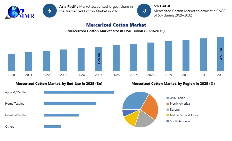 Mercerized Cotton Market was valued at USD 3.24 Bn in 2025 and is expected to reach USD 4.56 Bn by 2032 at a CAGR of 5% over the forecast period 2026-2032.