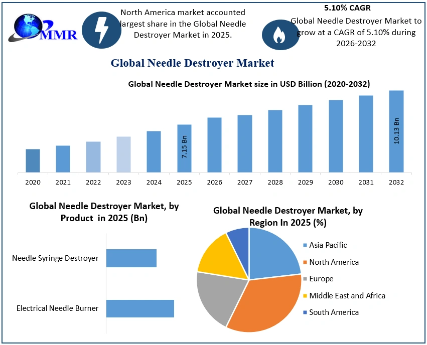 Global Needle Destroyer Market Report Coverage Details Base Year: 2025 Forecast Period: 2026-2032 Historical Data: 2020 to 2025 Market Size in 2025: USD 7.15 Bn . Forecast Period 2026 to 2032 CAGR: 5.10% Market Size in 2032: USD 10.13 Bn. Segments Covered: by Product Electrical Needle Burner Needle Syringe Destroyer by End User Hospital Ambulatory Surgical Center Diagnostic Laboratories HME and DME companies Needle Destroyer Market, by Region