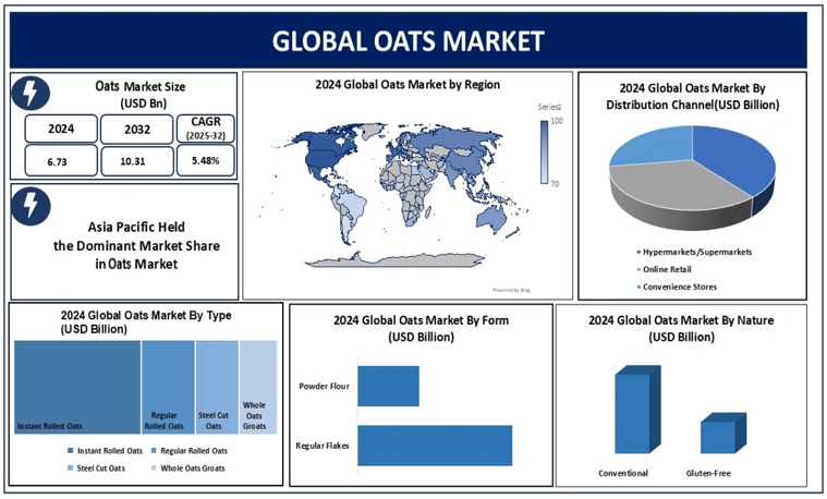 Global Oats Market Report Coverage Details Base Year: 2024 Forecast Period: 2025-2032 Historical Data: 2019 to 2024 Market Size in 2024: USD 6.73 Bn. Forecast Period 2025 to 2032 CAGR: 5.48% Market Size in 2032: USD 10.31 Bn. Segments Covered: by Type Instant Rolled Oats Regular Rolled Oats Whole Oats Groats Steel Cut Oats by Form Regular Flakes Powder Flour by Distribution Channel Hypermarkets/Supermarkets Convenience Stores Online Retail by Nature Gluten-Free Conventional Oats Market, by Region