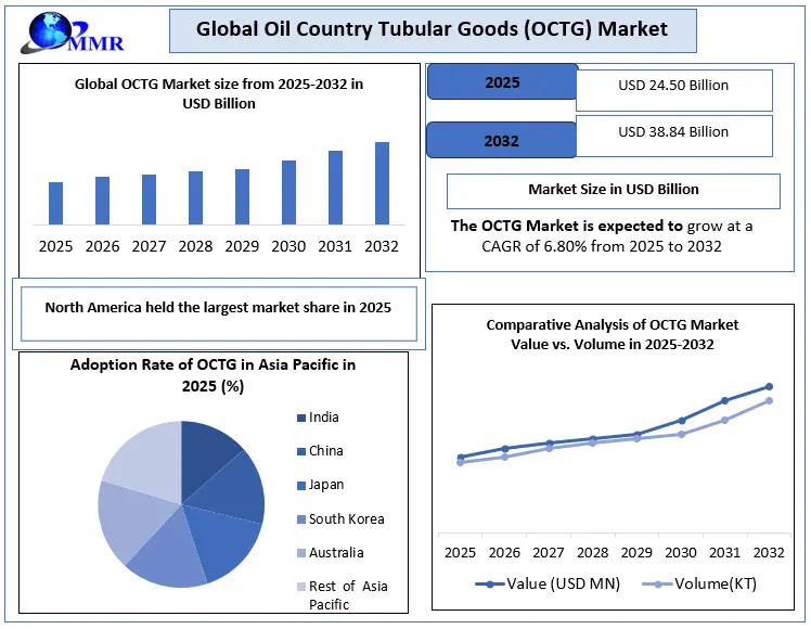 Answer: The OCTG Market was valued at USD 24.50 Billion in 2025 and is expected to grow at a 6.80% CAGR, reaching USD 38.84 Billion by 2032.