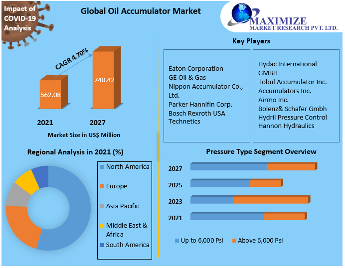 Oil Accumulator Market was valued at US$ 562.08 Mn in 2021 and is expected to reach US$ 811.6 Mn by 2029, at a CAGR of 4.70% during the forecast period. An accumulator is a pressure storage tank, which supplies a specific amount of fluid that is under pressure. This fluid is later unconstrained to perform a specific operation in the hydraulic system. The fluid, which is stored via an external source that can either be piston, spring, gas, and fluid. Oil accumulators are used for different purposes, comprising noise reduction as well as pulse dampening. These accumulators are available in different shapes as per the customization.To know about the Research Methodology:-Request Free Sample Report The report includes the analysis of the impact of COVID-19 lockdown on the revenue of market leaders, followers, and disruptors. Since the lockdown was implemented differently in various regions and countries; the impact of the same is also seen differently by regions and segments. The report has covered the current short-term and long-term impact on the market, and it would help the decision-makers to prepare the outline and strategies for companies by region. Increasing safety concerns and various environmental threats related to oil & gas exploration activities are expected to enhance the growth of the oil accumulator market. Fast exhaustion of crude oil reserves has prompted key players to take up new exploration developments to survive up with increasing demand. Furthermore, technical challenges faced by the manufacturers to produce accumulators to suit the appropriate application coupled with stringent environmental regulations may hamper the oil accumulator market growth. The bladder segment is expected to dominate the global oil accumulator market in the forecast period. The dominance of the market is attributed to increasing demand for bladder accumulators owing to the exploration and production spending and its wide usage in blowout preventer applications. High investment in onshore and offshore activities by emerging economies will be booming the oil accumulator market. It has high durability compared with other types. Blowout Preventer & Well Head Control is expected to lead the global oil accumulator market owing to its usage in the wide application of accumulators. These accumulators possess the capability to operate blowout preventer & wellhead control in case of a power failure, which is one of the key drivers for its dominance in the global oil & gas accumulator market in the forecast period. The up to 6,000 psi is estimated to contribute a major share in the oil accumulator market in 2017. The major contribution is driven owing to its usefulness for the application of multiple units in place of a single unit to reduce the idle time during production or drilling. Rising investments in the oil & gas industries are increasing the growth of the oil accumulator market. The report provides a detailed overview of the oil accumulator market including regional analysis information. Geographically, North America is expected to share a significant share of the growth in the oil accumulator market. The growth is attributed to digitalization in the oil & gas industry, and shale gas exploration in this region. The US and Canada are estimated to contribute a large amount of share in the oil accumulator market. Furthermore, Asia Pacific is projected to lead the oil accumulator market owing to the rapid industrialization and the increasing presence of the oil and gas industries in this region. The Middle East and Africa are also contributing share in the oil accumulator market owing to the presence of the oil and gas industry and the increasing investment in the oil sector. The report gives a clear representation of the current market scenario of the oil accumulator market, which includes projected market size in terms of value and volume, pestle analysis, Porter's analysis factors in the market.