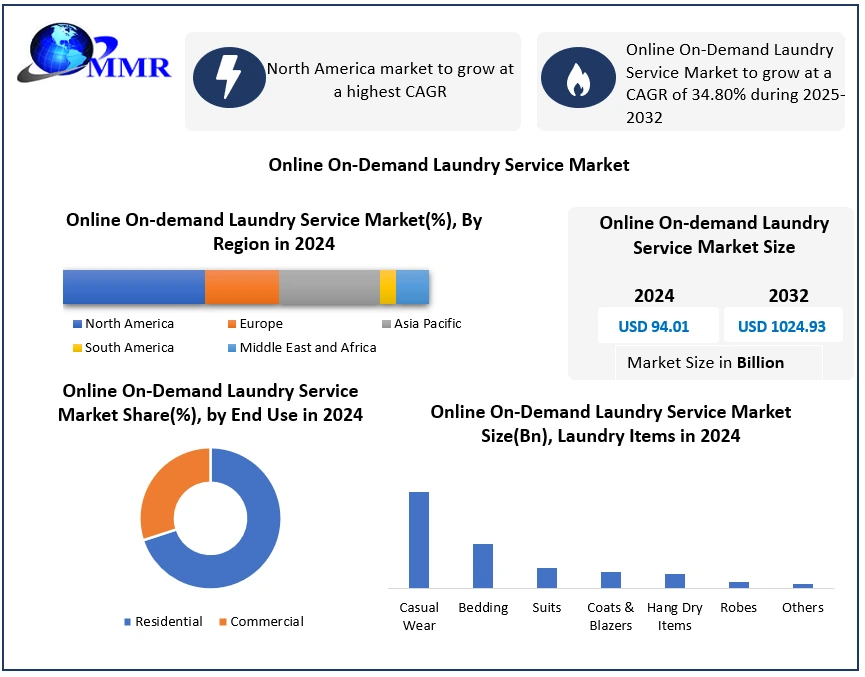 Global On-Demand Laundry Service Market Report Coverage Details Base Year: 2024 Forecast Period: 2025-2032 Historical Data: 2019 to 2024 Market Size in 2024: USD 94.01 Bn. Forecast Period 2025 to 2032 CAGR: 34.80% Market Size in 2032: USD 1024.93 Bn. Segments Covered: by Type Laundry Dry cleaning Duvet clean by Laundry Items Casual Wear Bedding Robes Hang Dry Items Suits Coats & Blazers Others by Service General Washing Wash & Fold Dry Cleaning Delivery Services Others by End-User Residential Commercial On-Demand Laundry Service Market, by Region