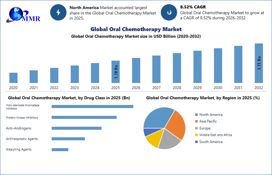 Oral Chemotherapy Market size was valued at US$ 1.78 Bn. in 2025 and the total Oral Chemotherapy revenue is expected to grow at 8.52% through 2023 to 2029, reaching nearly US$ 3.15 Bn by 2032.