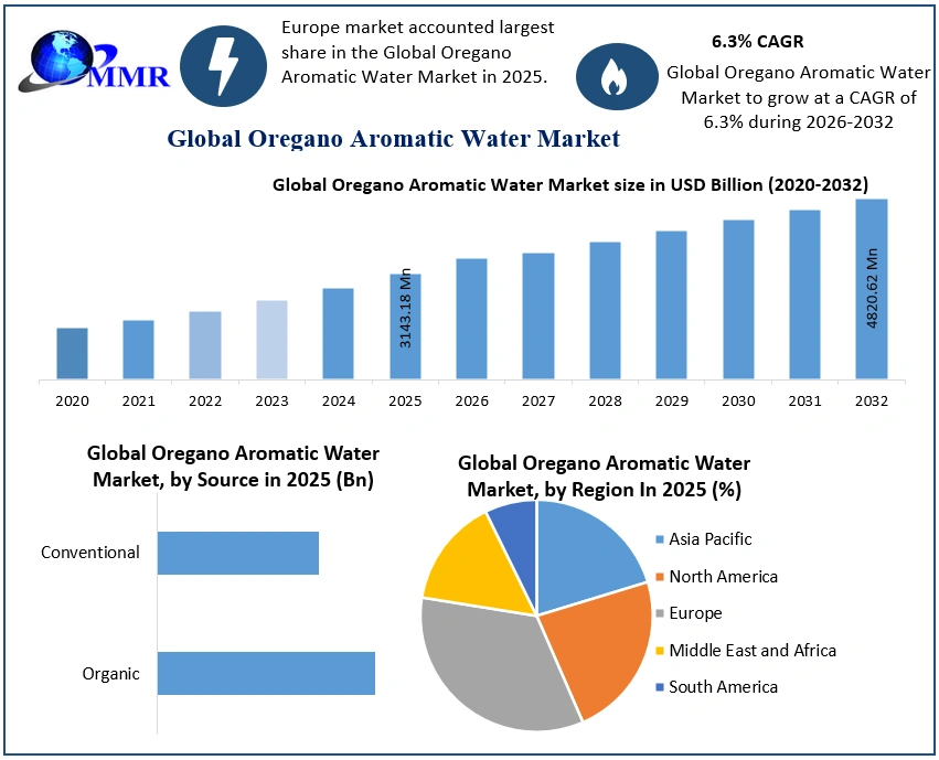Oregano Aromatic Water Market Report Coverage Details Base Year: 2025 Forecast Period: 2026-2032 Historical Data: 2020 to 2025 Market Size in 2025: USD 3143.18 Mn. Forecast Period 2026 to 2032 CAGR: 6.3% Market Size in 2032: USD 4820.62 Mn. Segments Covered: by Source Organic Conventional by Application Food industry Bakery industry Pharmaceuticals Livestock/Animal feed by Distribution Channel Direct Sales Indirect Sales Supermarkets Departmental Stores Retailers Others Global Oregano Aromatic Water Market, by Region